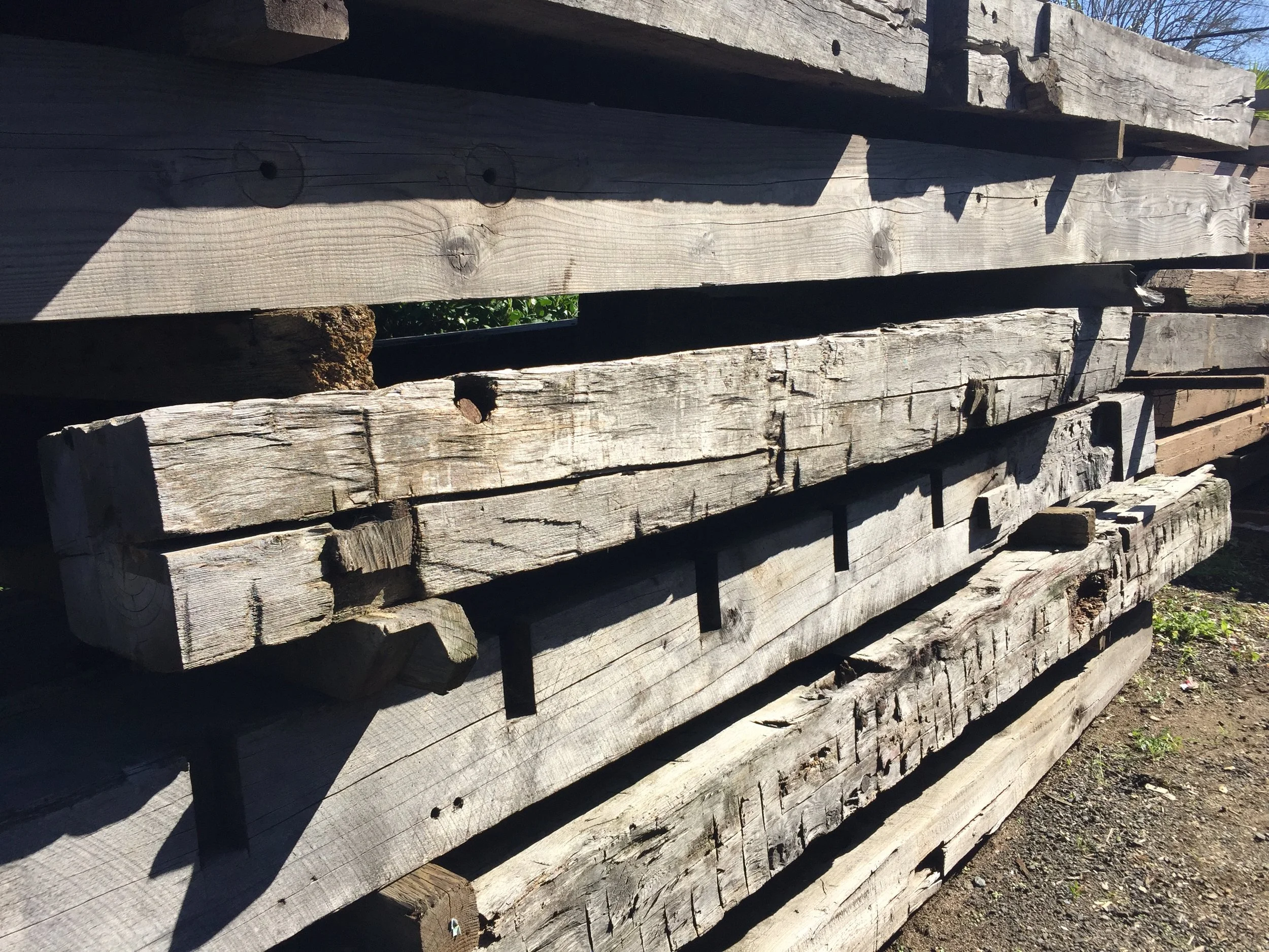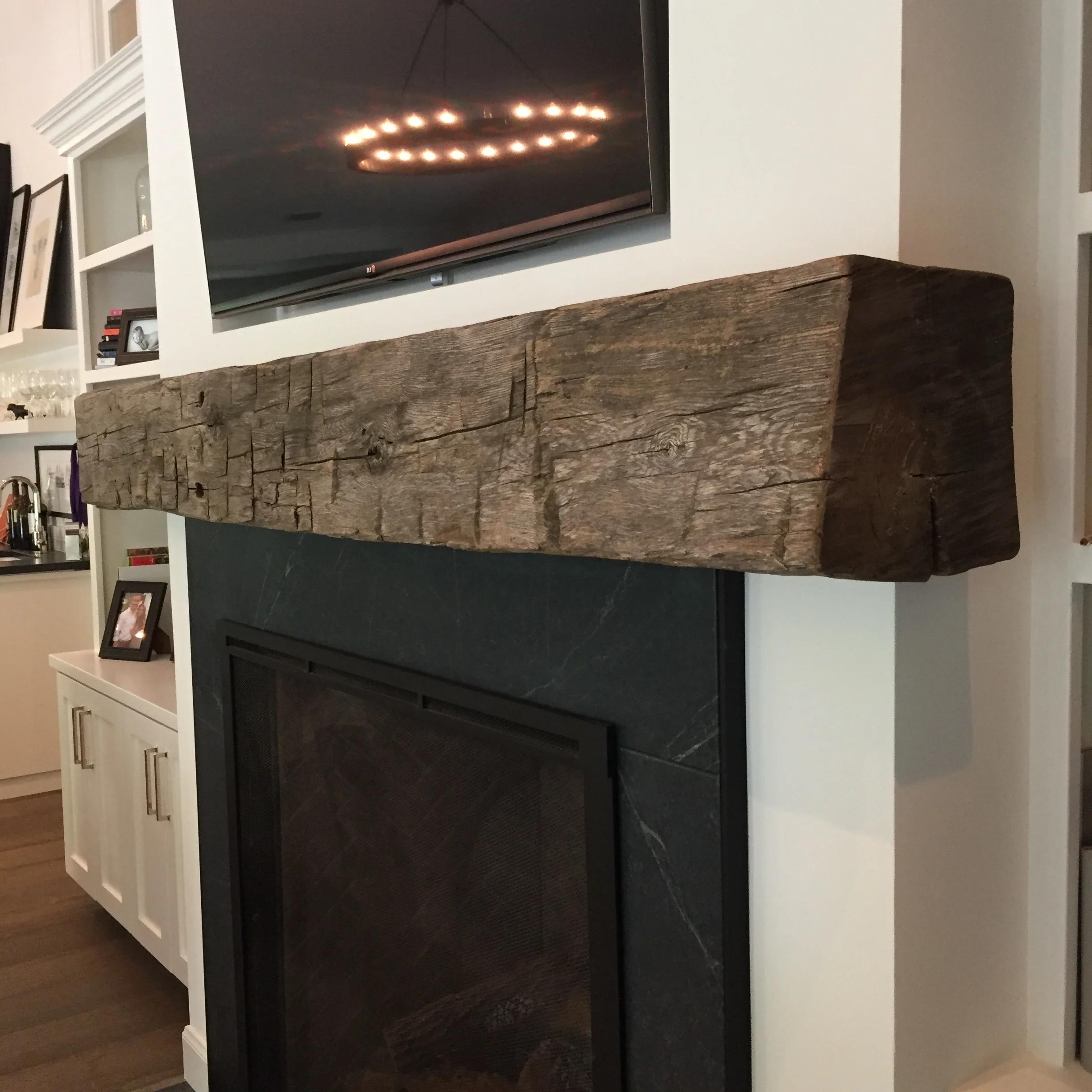 A mantle from a beam stack. Resized, cleaned up and notched to wrap around fireplace bump out.